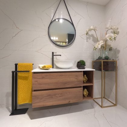 Móvel suspenso Neon 130x52x46 cm, estrutura tobacco com tampo branco. Design moderno e funcional que combina estilo, praticidade e otimização de espaço na casa de banho.